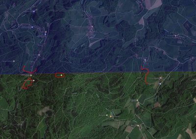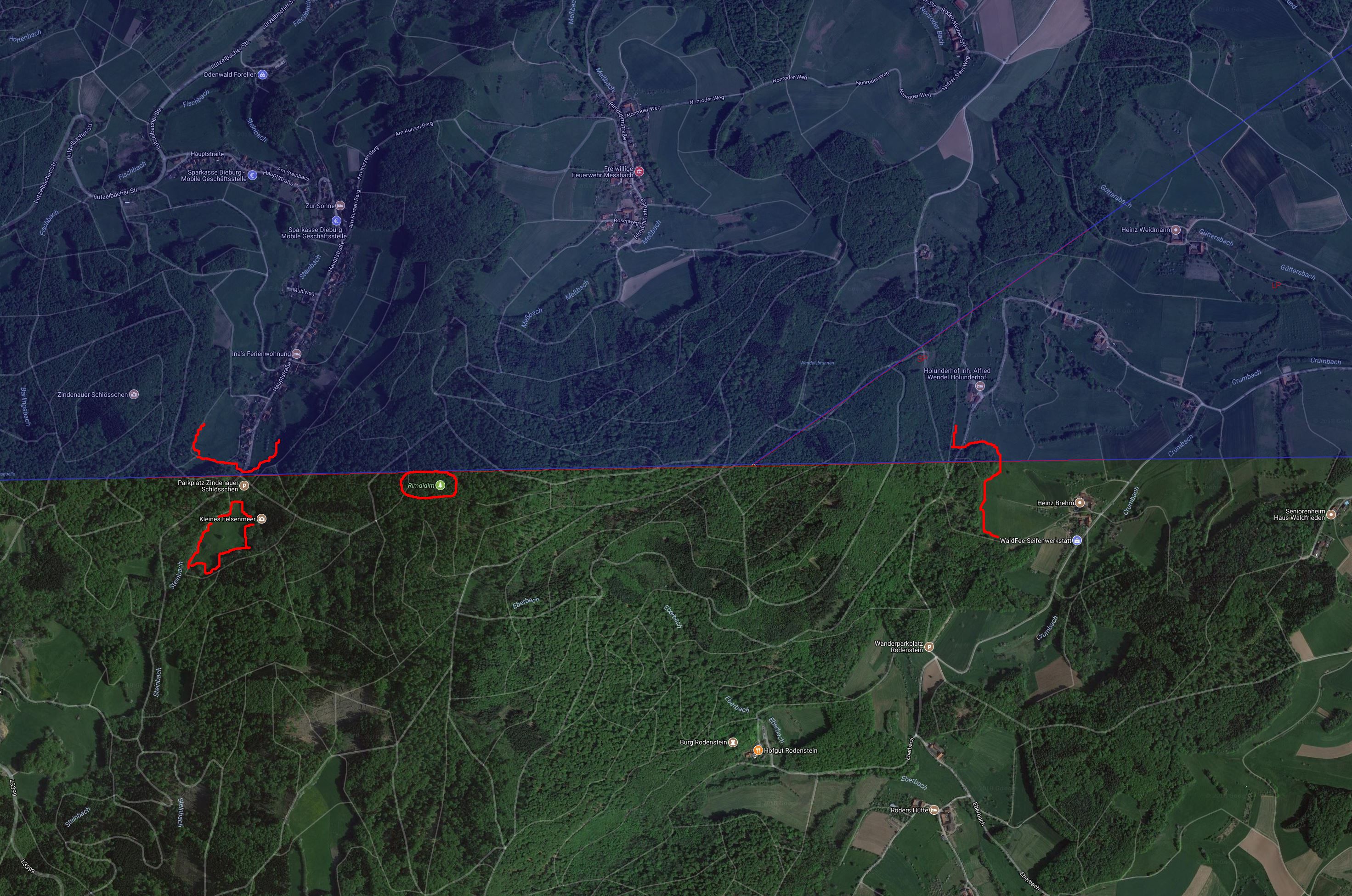 Man kann sich an einer gedachten Linie zwischen den letzten Häusern und Wiesen bei Steinau, der Rimdidim Bergkuppe, und dem runden Wäldchen südlich des Übungshangs orientieren: